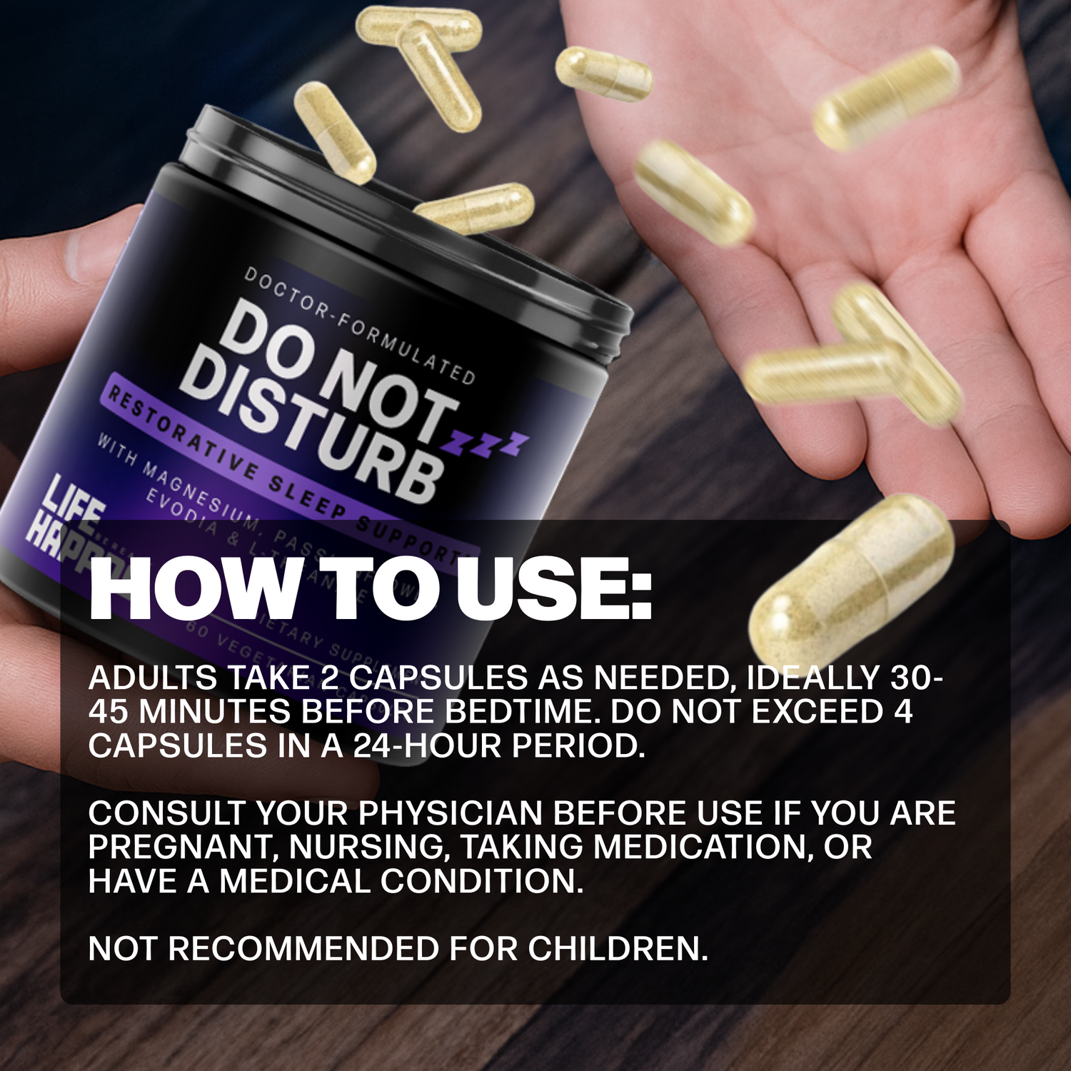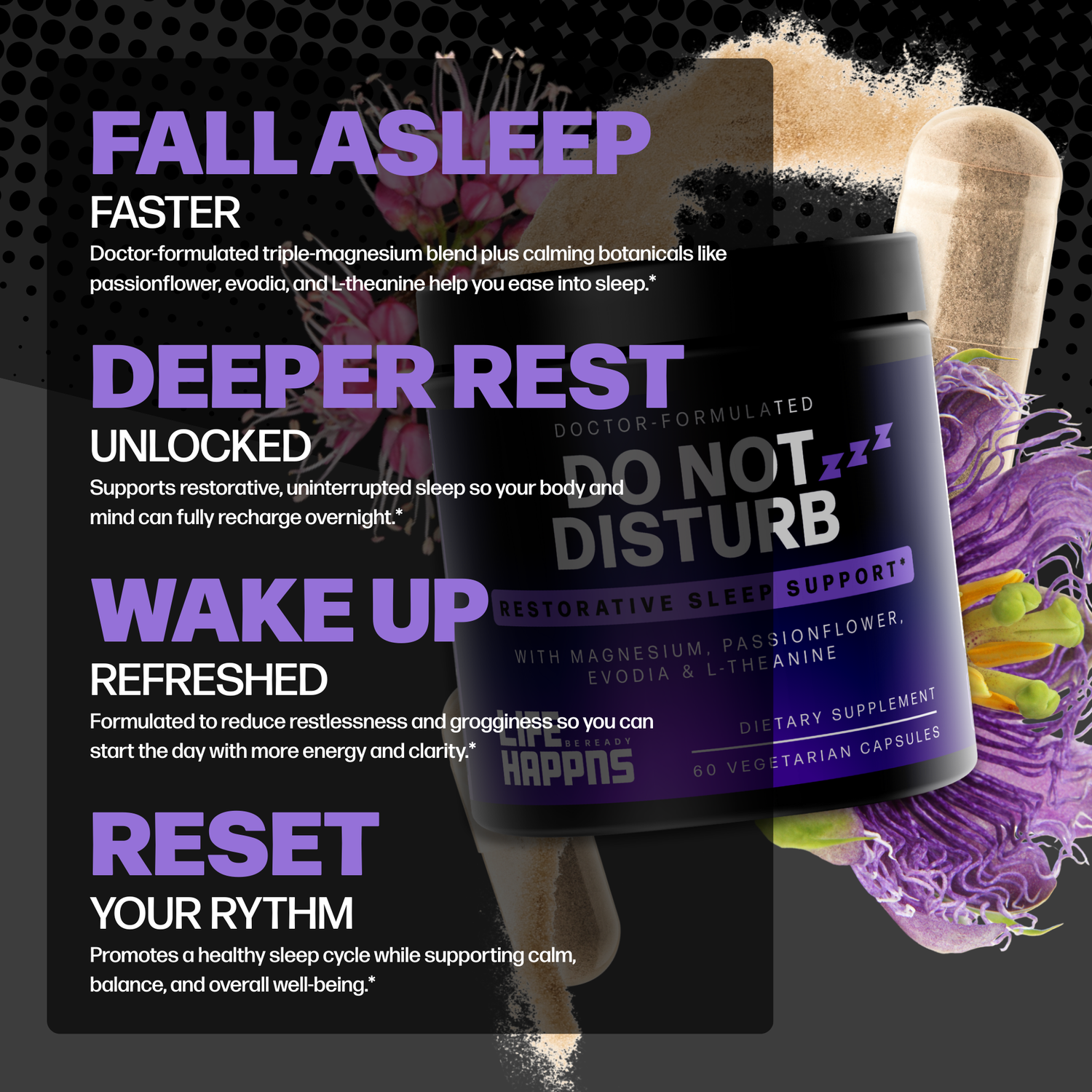 Experience undisturbed, rejuvenating sleep with Do Not Disturb, a carefully formulated natural sleep supplement featuring premium ingredients such as Passion Flower Extract, L-Theanine, and Evodia Fruit Extract. Designed to promote deep, restorative sleep and induce a state of relaxation, our product ensures a tranquil night's rest.
